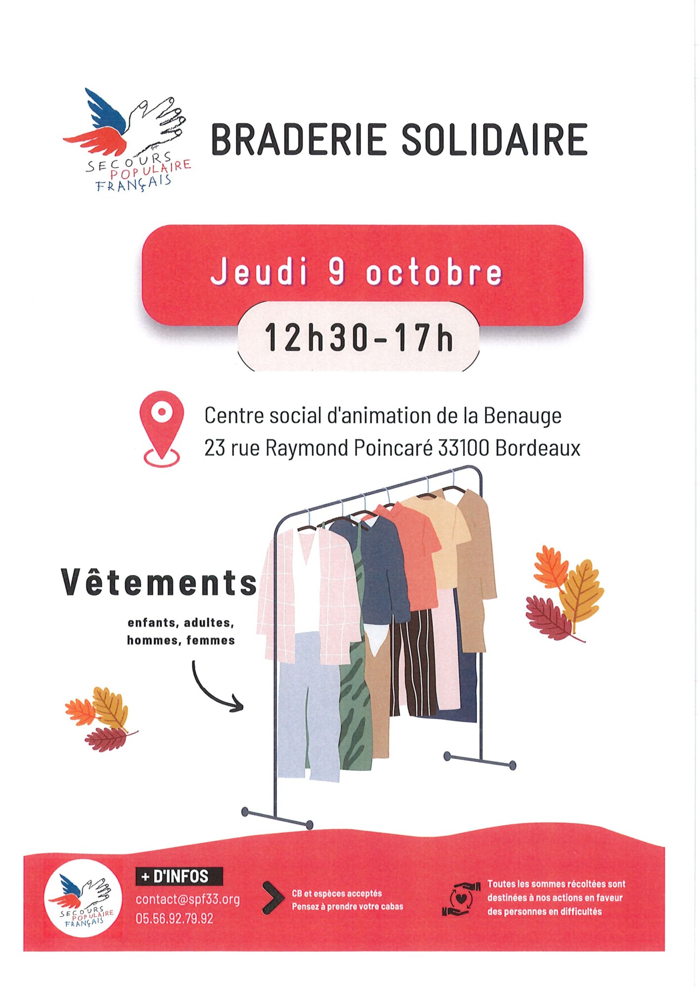 A noter dans vos agendas au centre d’animation Bastide Benauge le retour de la braderie du Secours Populaire Jeudi 9 octobre 2025 de 12h30 à 17h00.