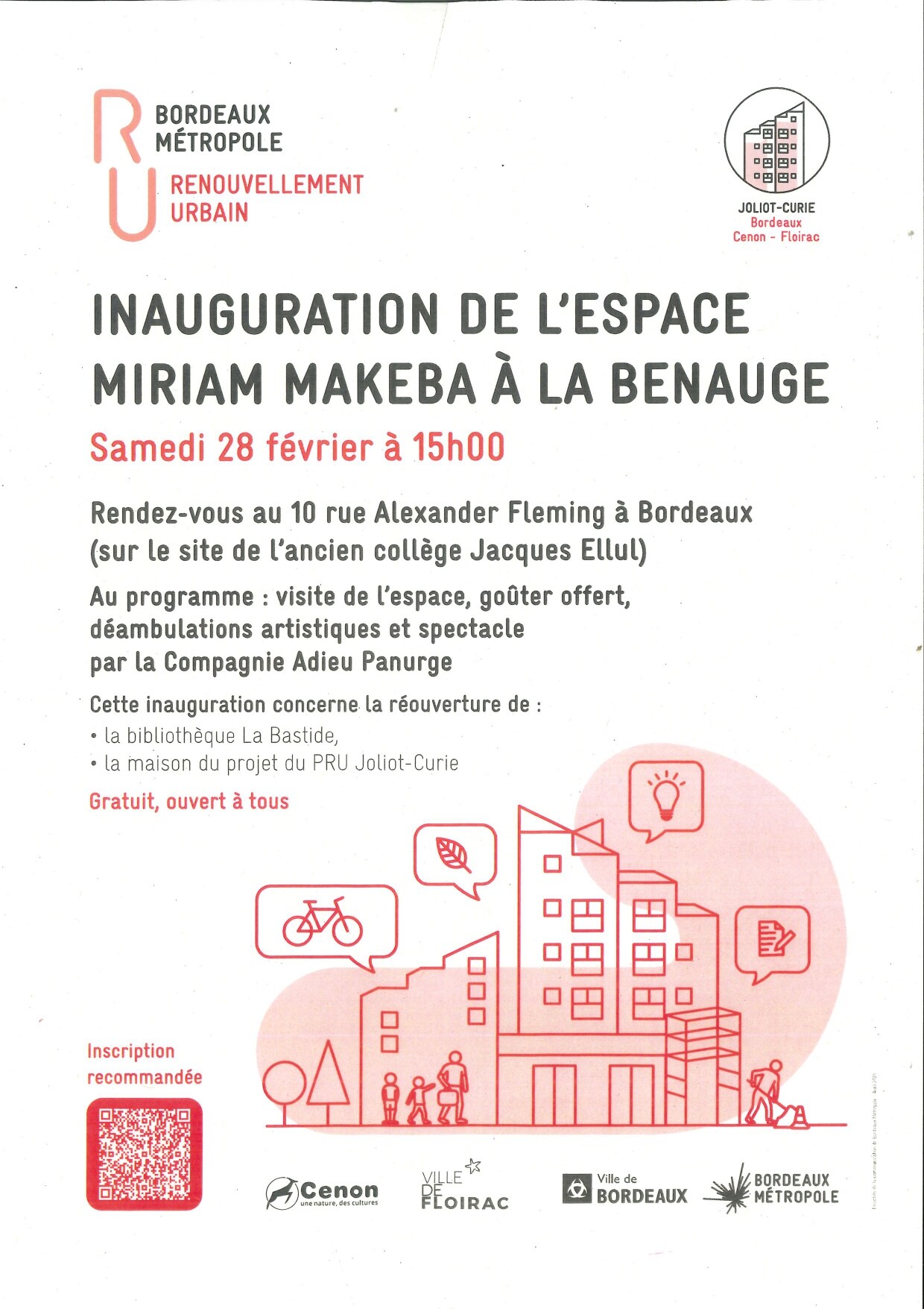 Inscription gratuite et recommandée : https://www.bordeaux-metropole.fr/formulaires/inauguration-lespace-miriam-makeba-au-sein-projet-renouvellement-urbain-joliot-curie