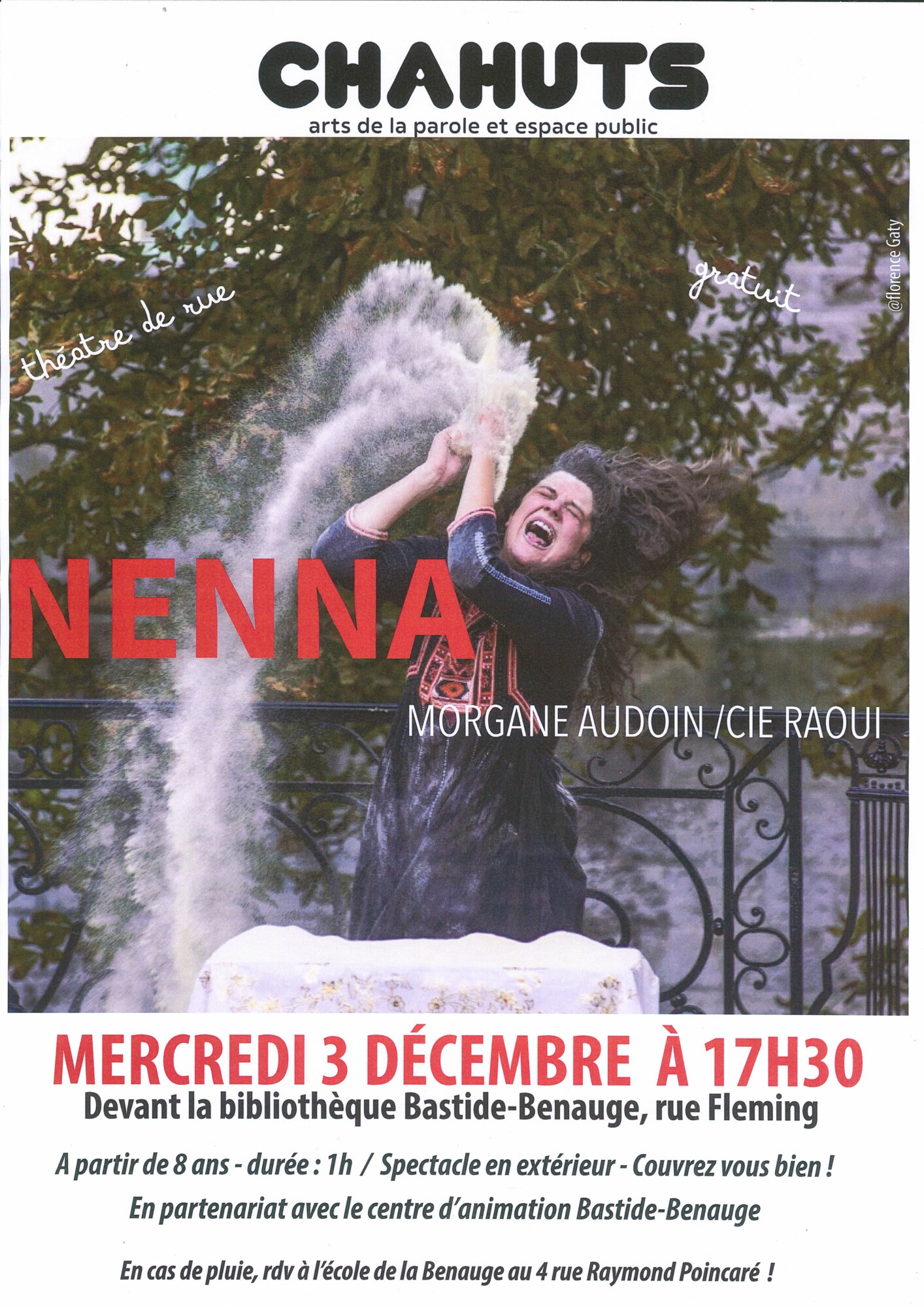 Mercredi 3 décembre à 17h30 – Rendez-vous devant la bibliothèque Bastide-BenaugeLa grand-mère de Morgane confectionne les msemens comme personne. Avec NENNA, qui signifie « mamie » en arabe algérien, la conteuse nous emmène dans sa quête : retrouver la recette idéale et le goût particulier des msemens, galettes feuilletées à base de semoule, que sa grand-mère lui prépare depuis l’enfance. Une recette, un savoir-faire qui a traversé le temps, les frontières et l’exil. Sur la route : des traces, des grains, des noms, des dates… comme autant d’ingrédients d’un récit à reconstituer. NENNA est le fruit d’une mémoire familiale qui s’est lentement tissée entre la France et l’Algérie, un témoignage fait de fragments d’histoires de guerre, d’indépendance et d’immigration. NENNA est une quête ancrée dans le présent : celui qui s’écrit ensemble, une poignée de semoule dans la main. A partir de 8 ans – Durée : 1h, suivi d’un goûter – Gratuit Spectacle en extérieur – Couvrez-vous bien ! En cas de pluie, rendez-vous à l’école de la Benauge au 4 rue Raymond Poincaré pour profiter du spectacle à l’abri ! En partenariat avec le centre d’animation Bastide-Benauge. |