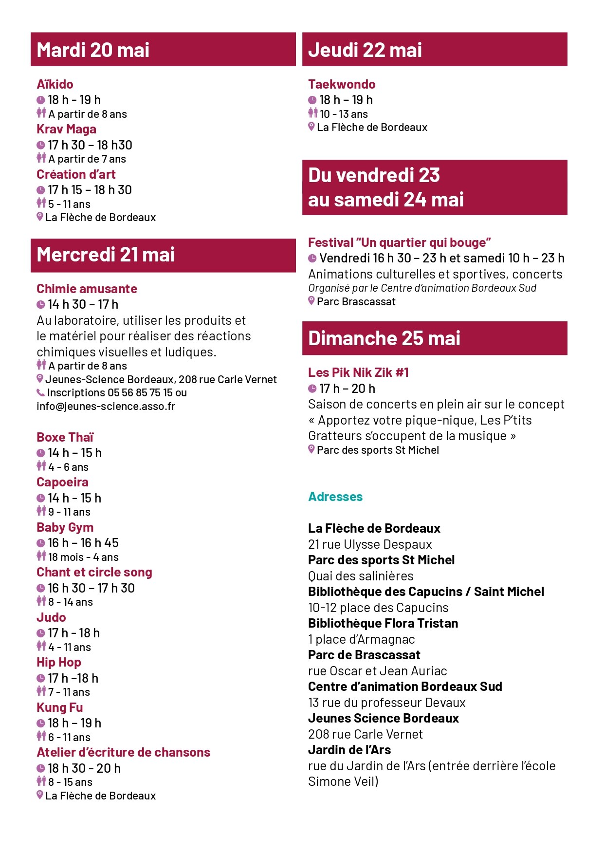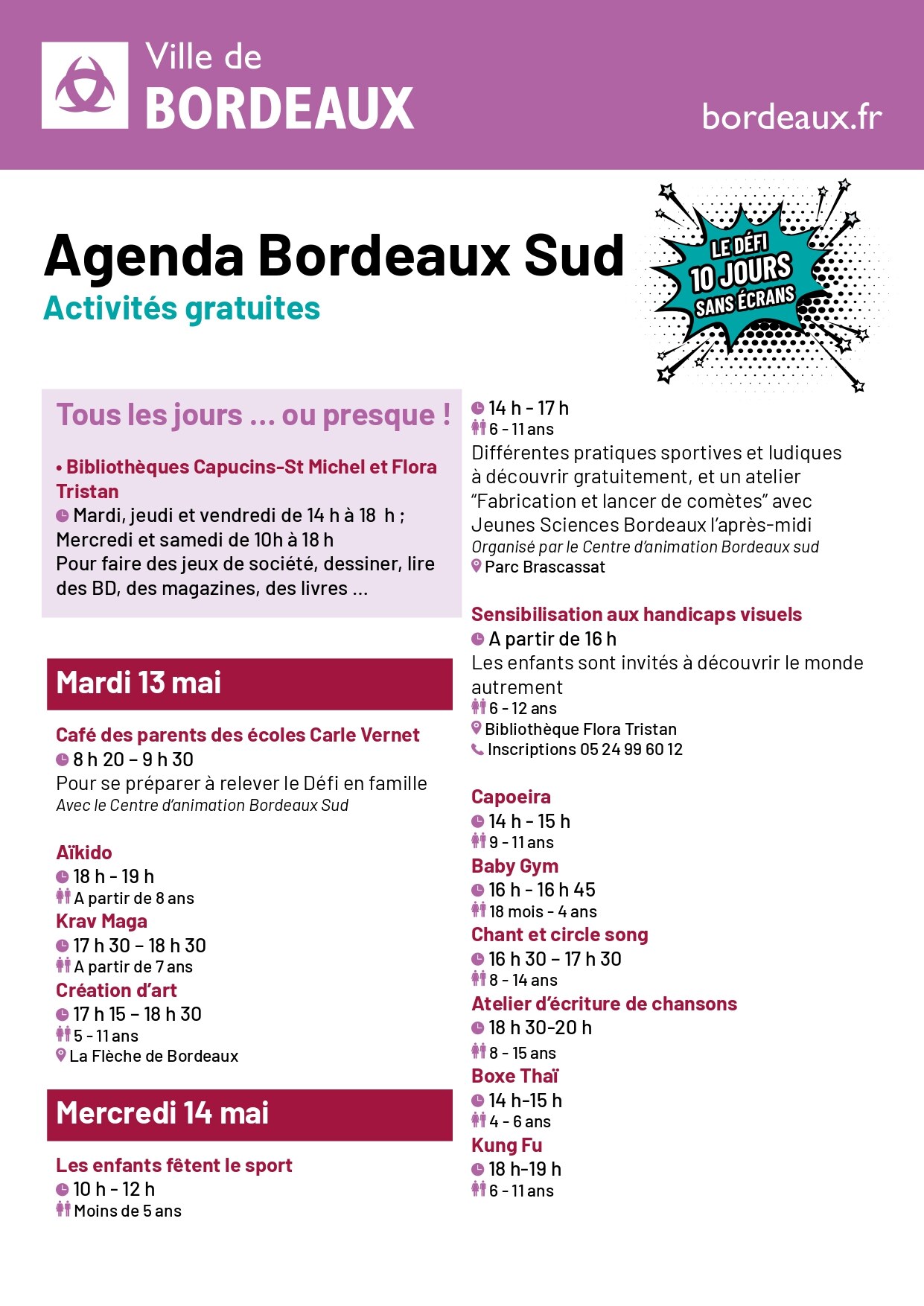 La mairie de Bordeaux, les écoles et les acteurs associatifs du quartier Bordeaux Sud, s'associent pour un grand défi à faire en famille : moins d'écrans pour plus de temps partagé. Un livret pour faire le défi et avoir la programmation des 10 jours sans écrans, sera distribué dans les écoles en amont. Vous retrouvez aussi bien des moments ludiques, …