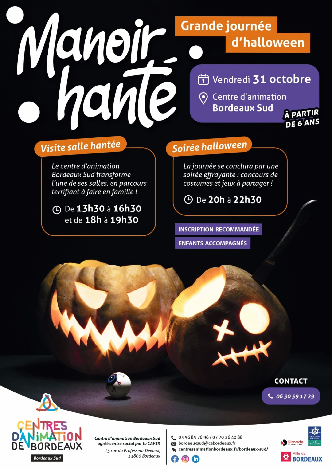 Le grand retour du Manoir Hanté ! Cette année, le centre d’animation Bordeaux Sud se transforme… et vous ouvre les portes de son terrifiant Manoir Hanté !Entre frissons et fous rires, venez vivre une expérience unique le vendredi 31 octobre, de 13h30 à 16h30 puis de 18h00 à 19h30. Pour encore plus d’immersion, sortez vos plus beaux costumes : sorcières, …